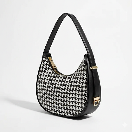A stylish shoulder bag with a timeless black and white houndstooth pattern and modern half-moon shape. Perfect for adding a classy touch to any outfit.